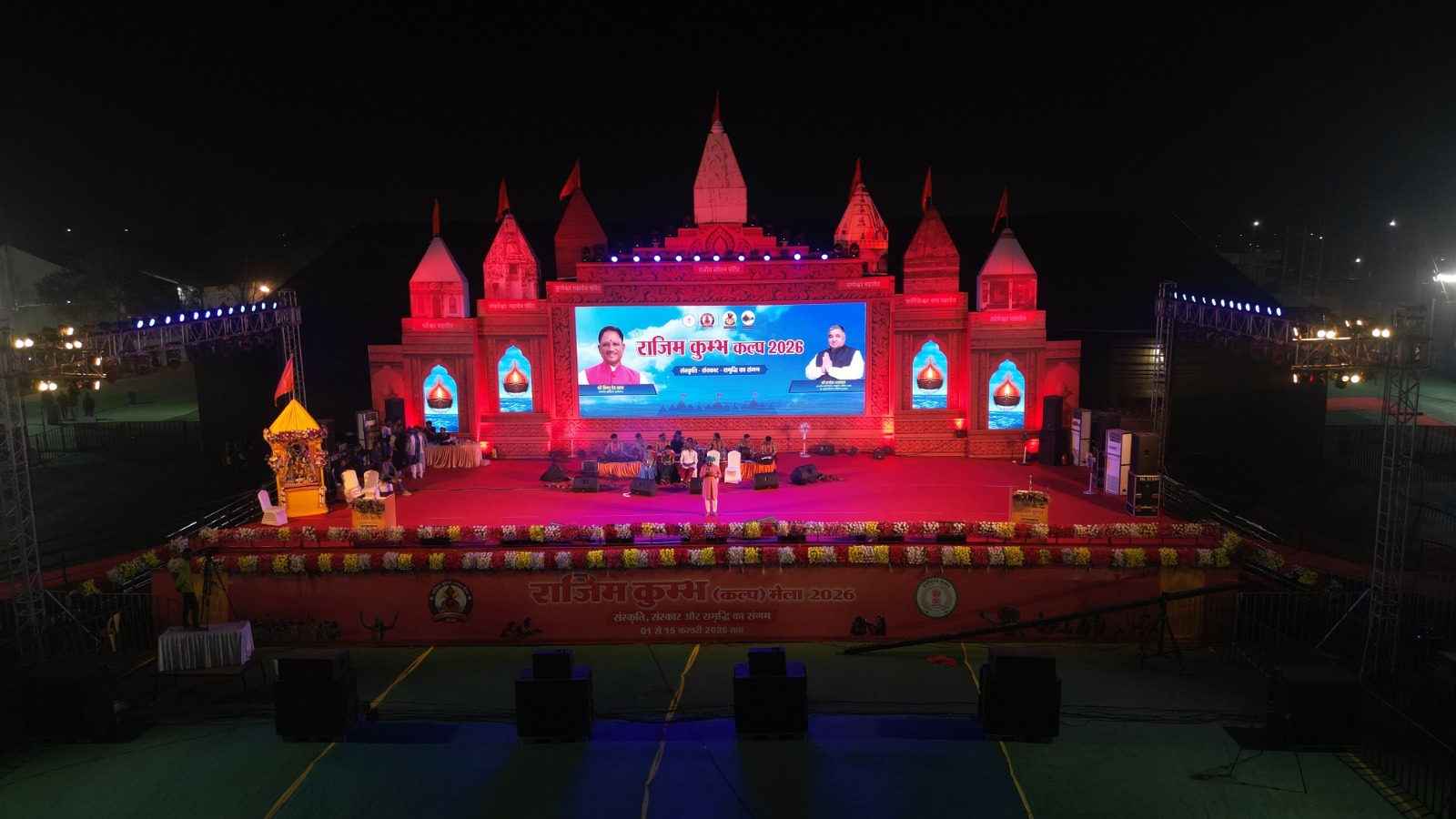 राजिम कुम्भ कल्प के मुख्य मंच को इस वर्ष विशेष रूप से आकर्षक स्वरूप दिया गया है। लगभग 60 फीट चौड़े और 80 फीट लंबे इस विशाल मंच की पृष्ठभूमि में पंचकोशी धाम के प्रमुख मंदिरों की सजीव झलक श्रद्धालुओं को आध्यात्मिक अनुभूति करा रही है। भगवान श्री राजीवलोचन एवं कुलेश्वरनाथ महादेव के साथ पटेश्वरनाथ (पटेवा), चम्पकेश्वरनाथ (चम्पारण), ब्रह्मकेश्वरनाथ (ब्रह्मनी), फणीकेश्वरनाथ (फिंगेश्वर) और कोपेश्वरनाथ (कोपरा) के मंदिरों की प्रतिकृतियां बांस और कपड़े से निर्मित की गई हैं। पारंपरिक शिल्प और आधुनिक साज-सज्जा का यह संतुलित समन्वय मंच को विशिष्ट गरिमा प्रदान कर रहा है।